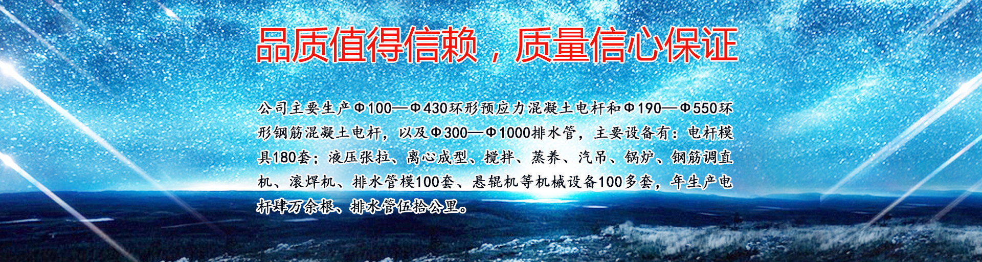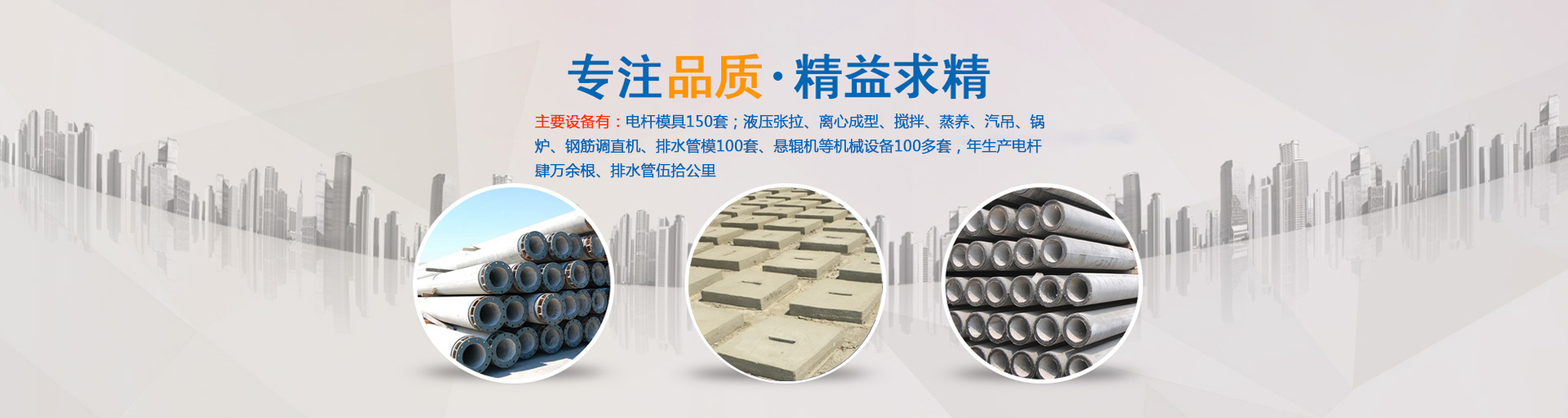 公司主要生產ф100—ф430環形預應力混凝土電桿和ф190—ф550環形鋼筋混凝土電桿,以及ф300—ф1000排水管,主要設備有:電桿模具180套;液壓張拉、離心成型、攪拌、蒸養、汽吊、鍋爐、鋼筋調直機、滾焊機、排水管模100套、懸輥機等機械設備100多套,年生產電桿肆萬余根、排水管伍拾公里?!?